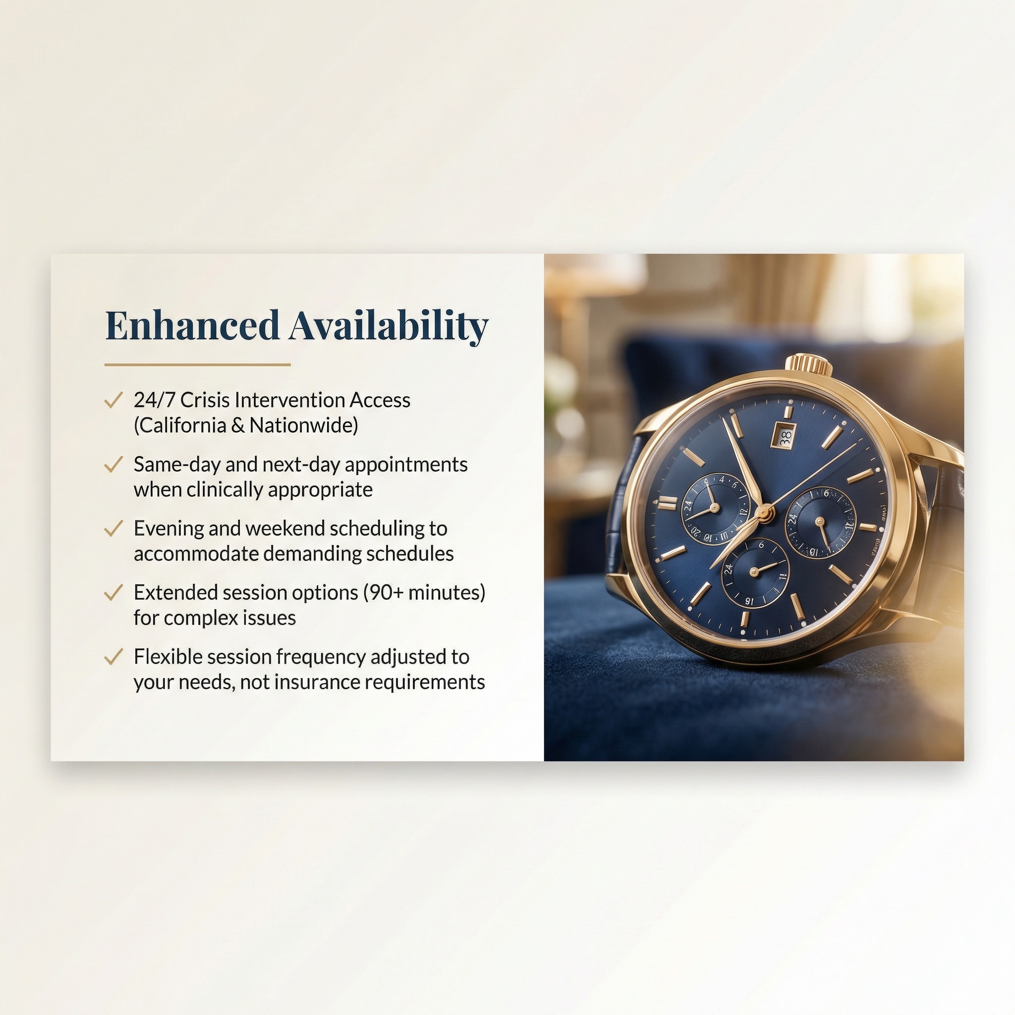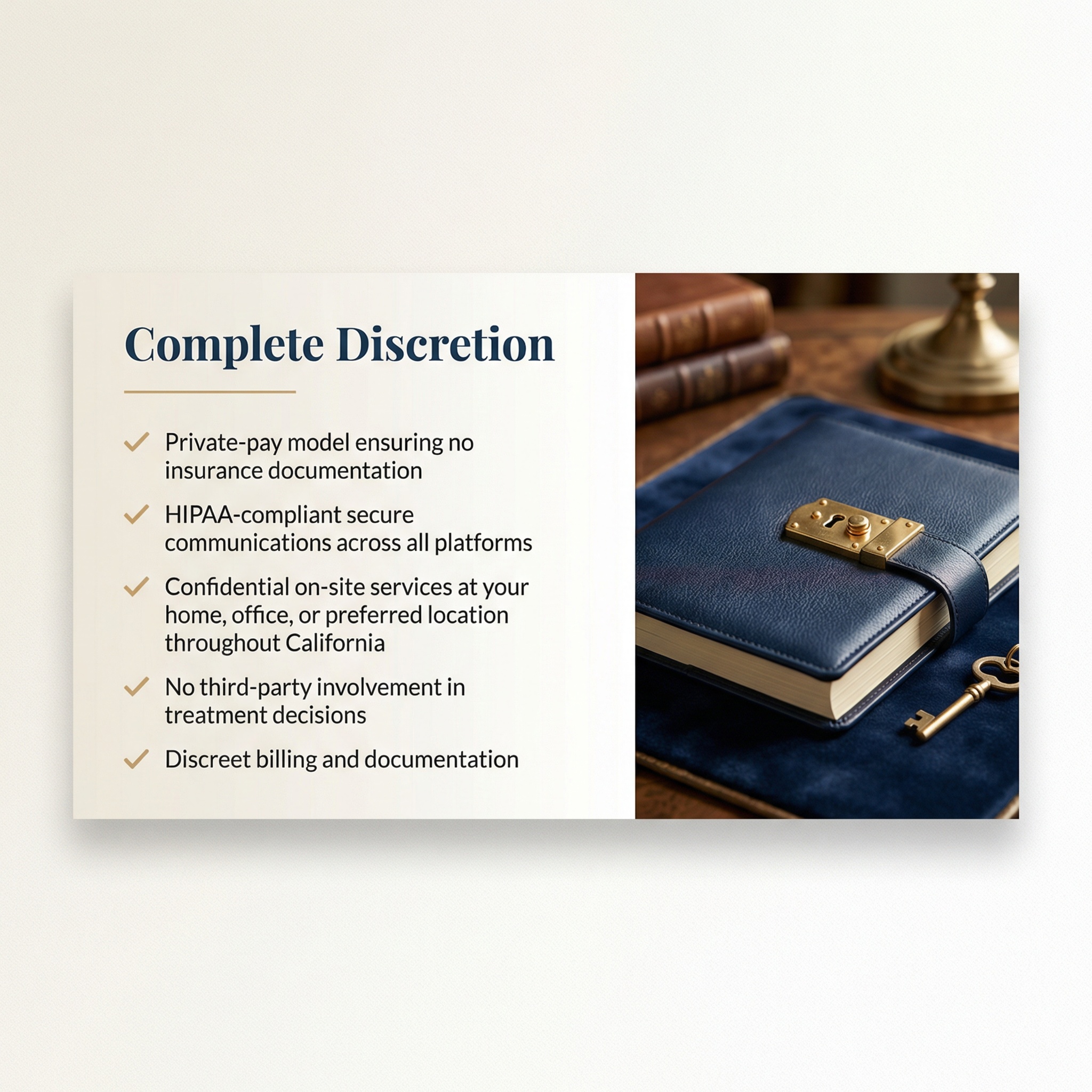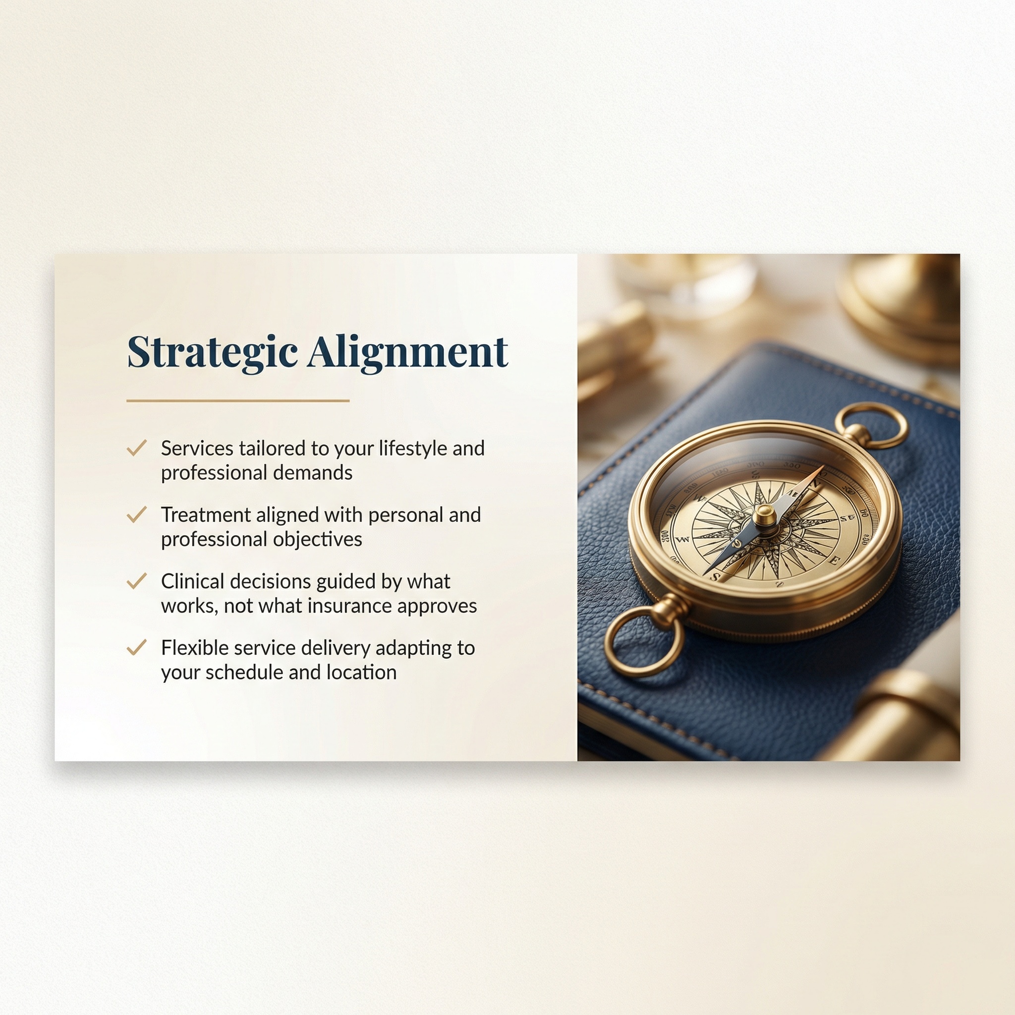 Our concierge model goes beyond traditional therapy, offering premium services tailored to the unique demands of high-net-worth professionals, C-suite executives, physicians, attorneys, and clients who value exceptional care delivered with flexibility and precision.