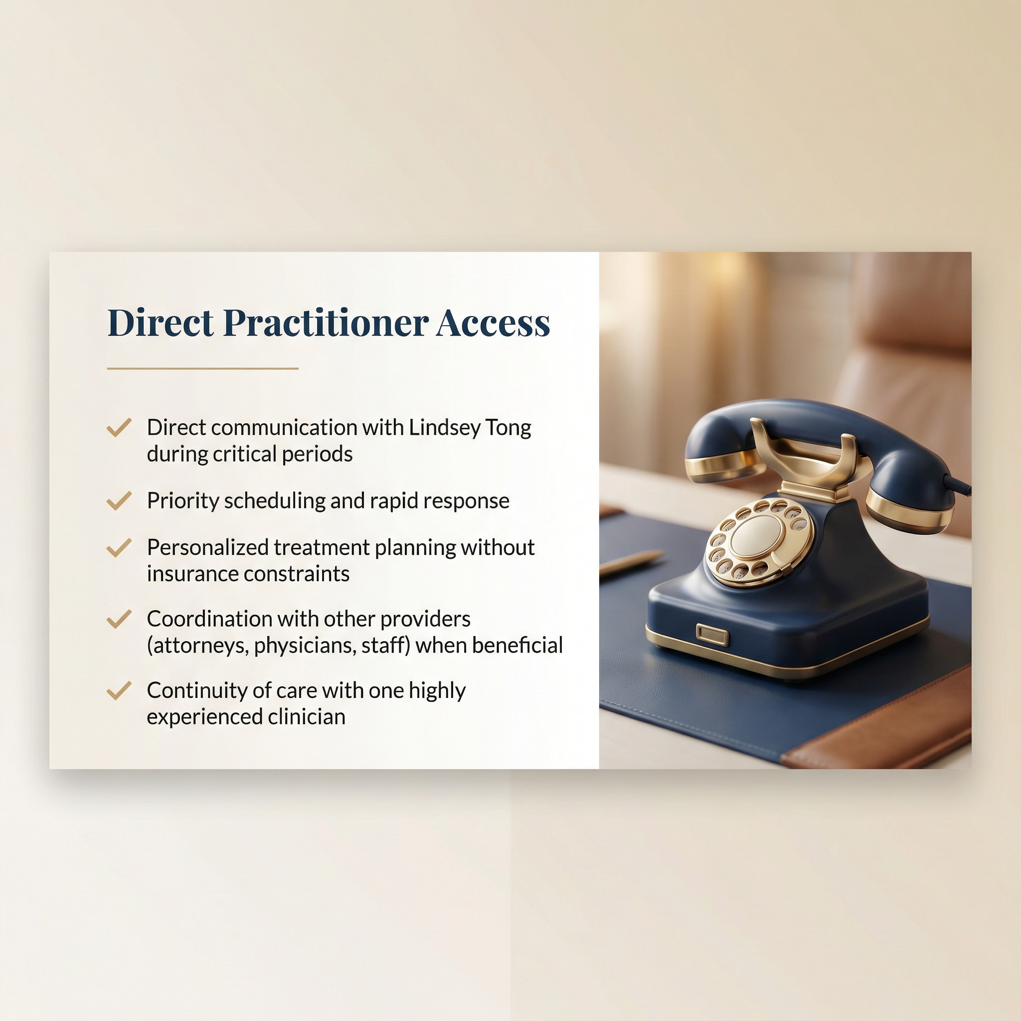 LT Clinical Consulting & Concierge Services provides concierge-level psychological care designed for individuals who require enhanced availability, complete discretion, and direct practitioner access during critical periods.